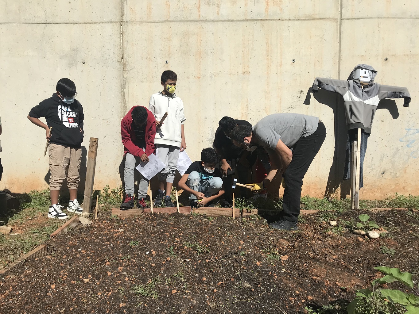 El terreny està darrera l’institut. Ens va ajudar l’Ivan, conserge de l’institut, i vam utilitzar unes estaques, un martell, una cinta de medir i un cordill. El bancal té 150 centímetres d’ample i uns 3 metres de llarg.