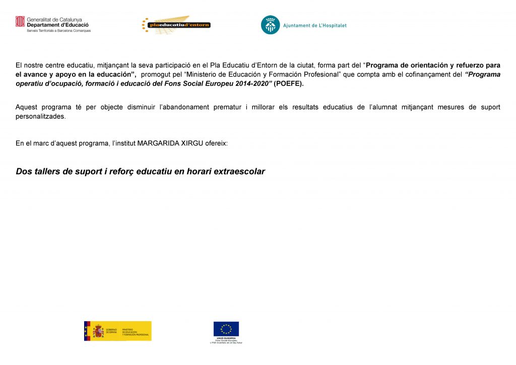 Aquest mes de març comencen els tallers d’estudi assistit a 1r i 3r ESO gràcies al Programa operatiu d’ocupació, formació i educació, FSE 2014-2020. Aquest programa està finançat pel Ministeri d’Educació i Formació Professional i cofinançat pel Fons Social Europeu.