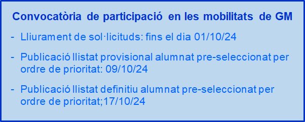 Mobilitats CFGM. Curs 2024-25Per admin / 2 d'octubre de 2024 / Cicles Formatius Informacions 24-25 Portada Obert el termini de participació en les mobilitats d’alumnat de Cicles Formatius de Grau Mitjà.