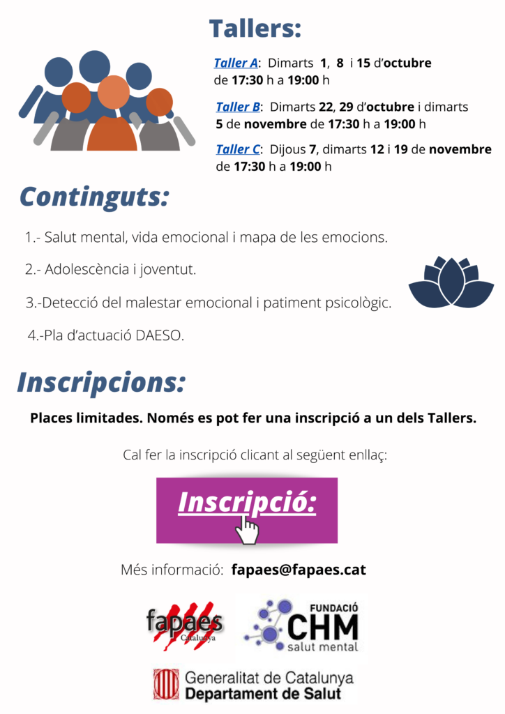 La fundació CHM Salut Mental Barcelona, amb la col.laboració de FAPAES, tornen amb una nova edició dels Tallers de Primers Auxilis en Salut Mental Juvenil (PASM-JUVE) amb diferents torns per escollir: