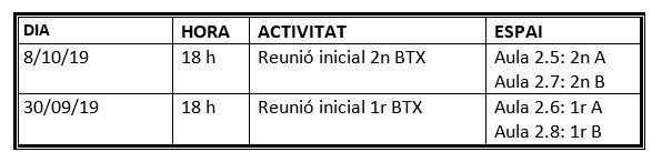 Les dates de les reunions de mares i pares amb tutors i tutores de Batxillerat són les següents:
