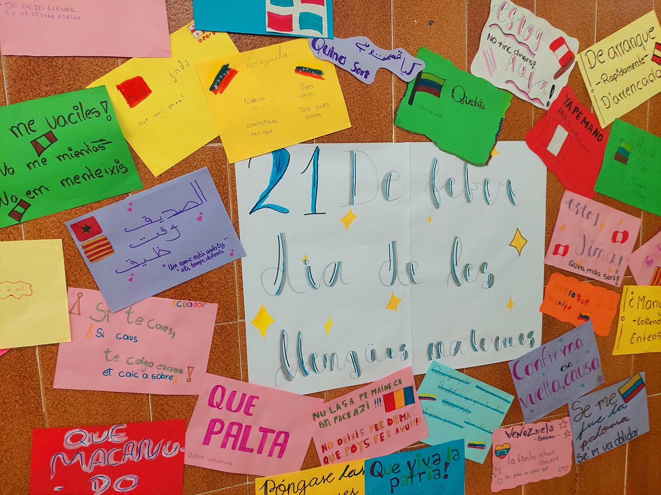 A l’aula d’acollida, aprofitant que el 21 de febrer és el Dia Internacional de les Llengües Maternes, els alumnes hem compartit expressions típiques de la nostra llengua materna i hem pensat com les podríem traduir al català. De pas, hem fet un mural que podreu veure fins finals de març davant la nostra aula.