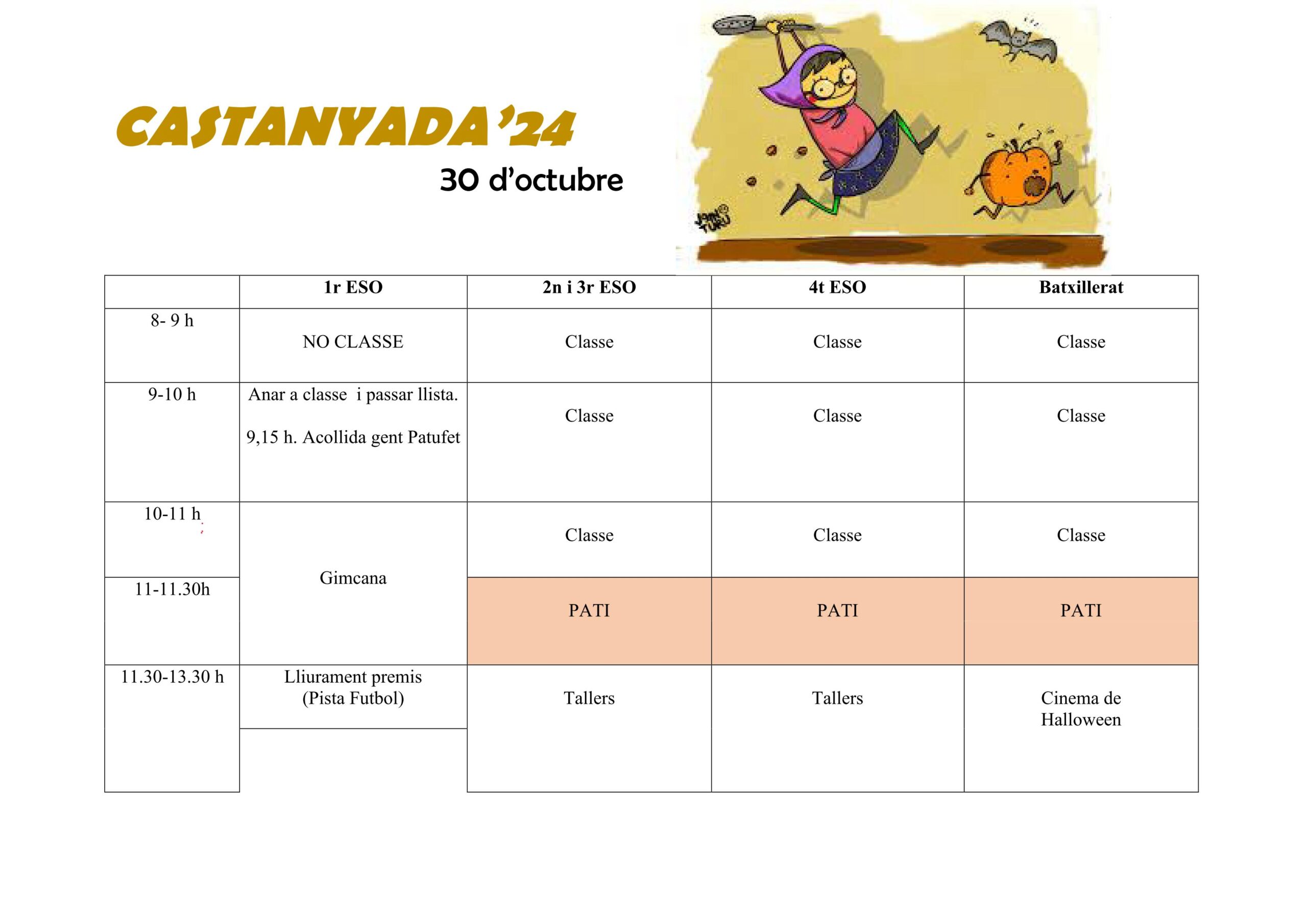 La resta d’alumnat de l’ESO i Batxilleratfarà classe de 8 a 11h i després de l’esbarjo, els de l’ESO faran tallers i els de Batxillerat, veuran una pel.lícula.