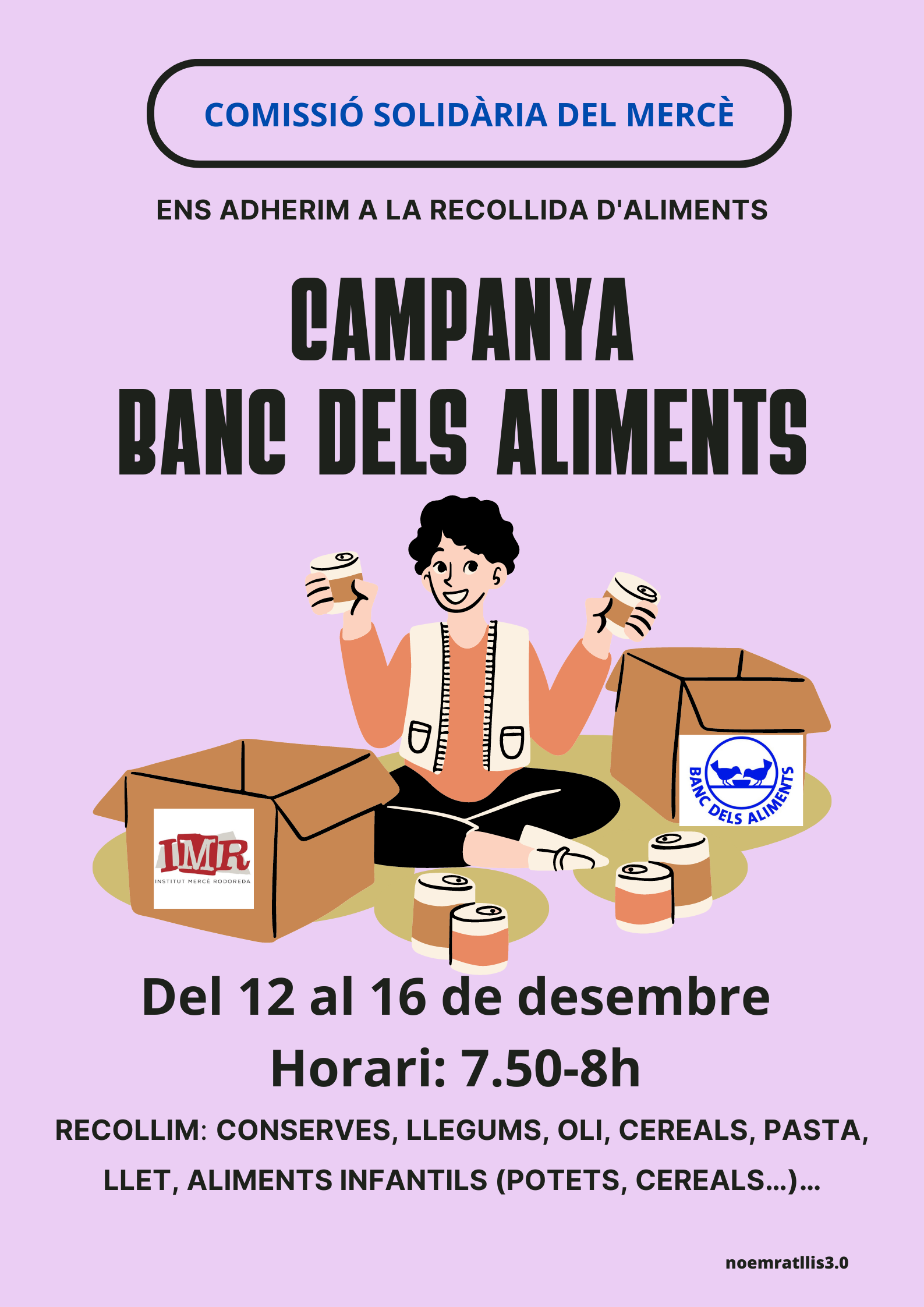 Ja sabem que el 25 i el 26 de novembre es recullen els aliments als mercats i als supermercats, però pensem que seria bo que els vostres fills, els nostres alumnes, fessin el gest de col·laborar-hi responsabilitzant-se de portar els aliments fins a l’institut, ja que amb l’experiència és com s’aprèn