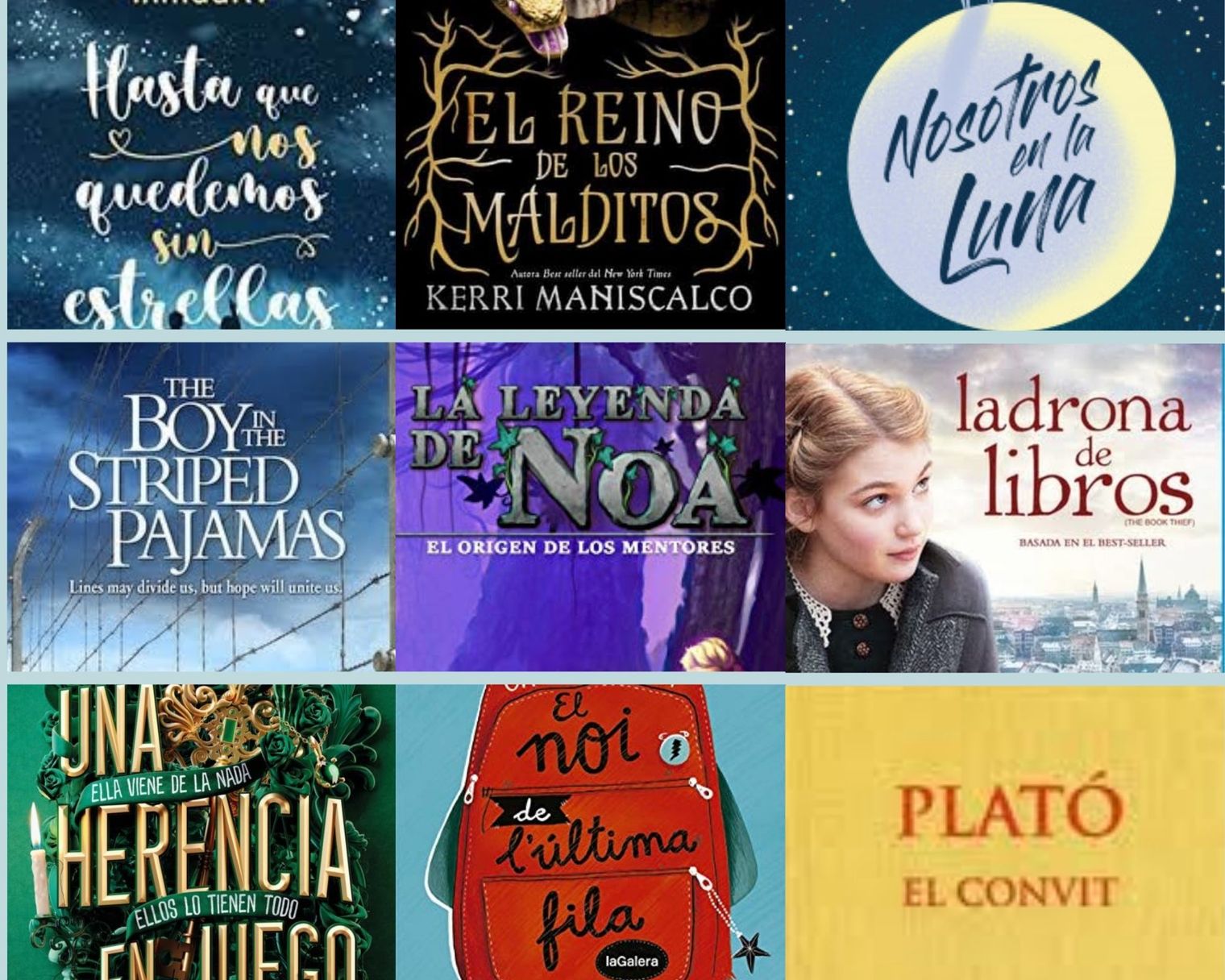 Hasta que nos quedemos sin estrellas – El Reino de los malditos – Nosotras en la luna – The boy in the striped pyjama – La leyenda de Noa (trilogia) – La ladrona de libros – Una herencia en juego – El noi de l’última fila – Plató. El convit.