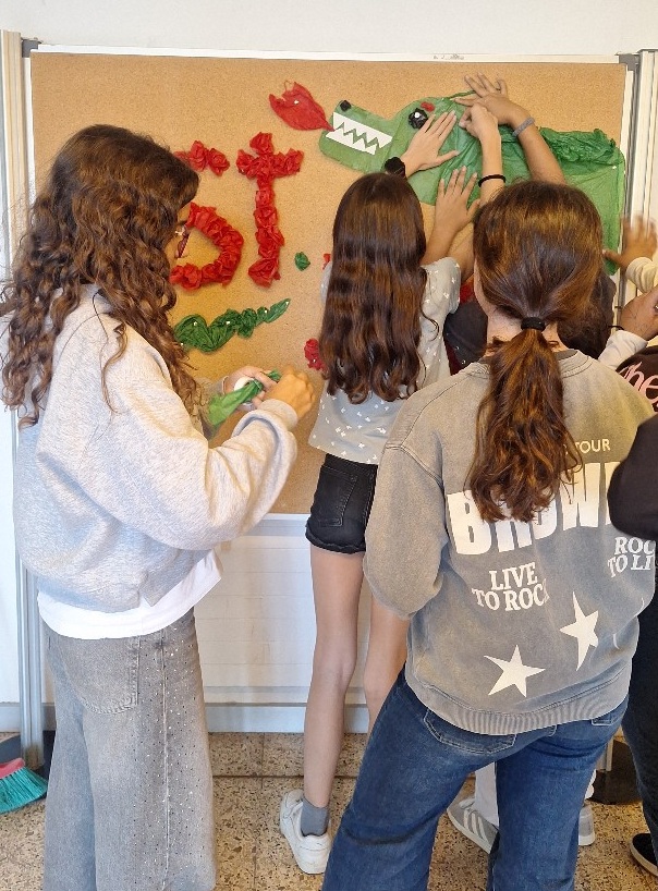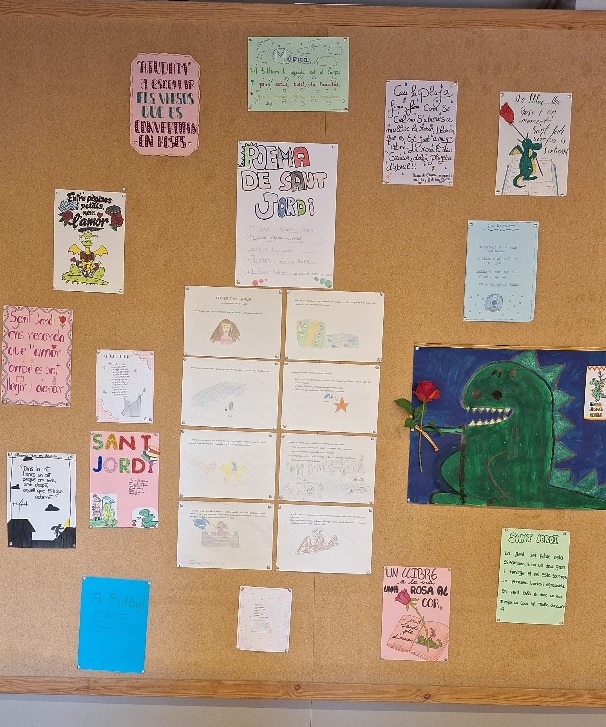 Aquests dies el centre està ben engalanat. L’alumnat de SIAL, PT i Acollida han muntat un mural amb llegendes, poemes, textos i dibuixos dedicats a Sant Jordi i la llegenda. A Català i Visual i Plàstica de 1r d’ESO s’ha creat un mural a partir del projecte Rutes literàries per L’Hospitalet. En aquest sentit, s’han dibuixat retrats dels autors literaris presents al nomenclàtor de L’H i s’ha especificat amb una fitxa diversa informació (barri on hi ha el carrer, data naixement/mort/lloc de l’autor, gènere conreat i obres més emblemàtiques). Finalment alumnat de diversitat de 1r d’ESO ha muntat un bonic mural amb roses i un drac, realitzat amb paper de seda. Bon Sant Jordi per a tothom! Regaleu llibres i roses.