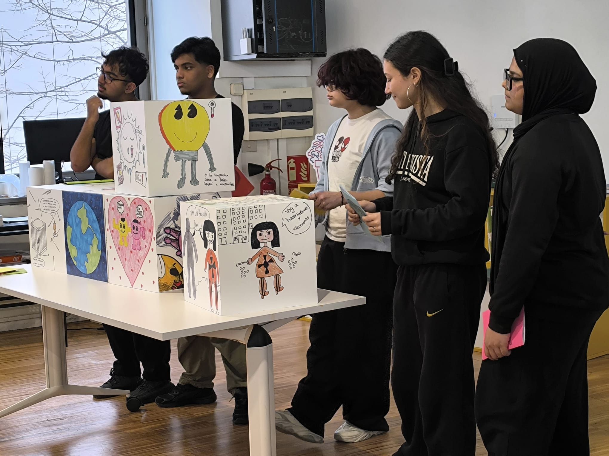 Com en tots els projectes d’Escola en Residència, hi ha una dimensió artística que enriqueix la mirada sobre el coneixement. En aquesta ocasió, hem treballat amb els artistes de La Gossa per crear còmics en format de cub que expliquen, de manera creativa i comprensible, alguns dels conceptes científics més complexos. El resultat: peces artístiques que són alhora interessants, educatives i sorprenentment expressives.