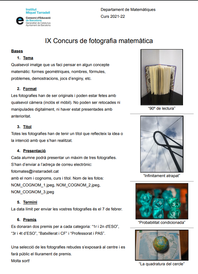 Un cop més, tenim l’oportunitat de mirar el món amb ulls matemàtics. Una nova edició del concurs de fotografia matemàtica arrenca amb l’any: a continuació trobareu les bases acompanyades de les imatges guanyadores de la passada convocatòria.