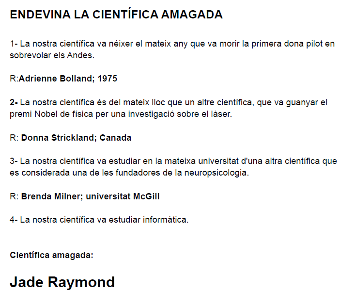 Aquí teniu les solucions del concurs. Esperem que l’hàgiu gaudit i que hi hagi sort! De moment, us deixem la seva biografia i una entrevista amb ella.