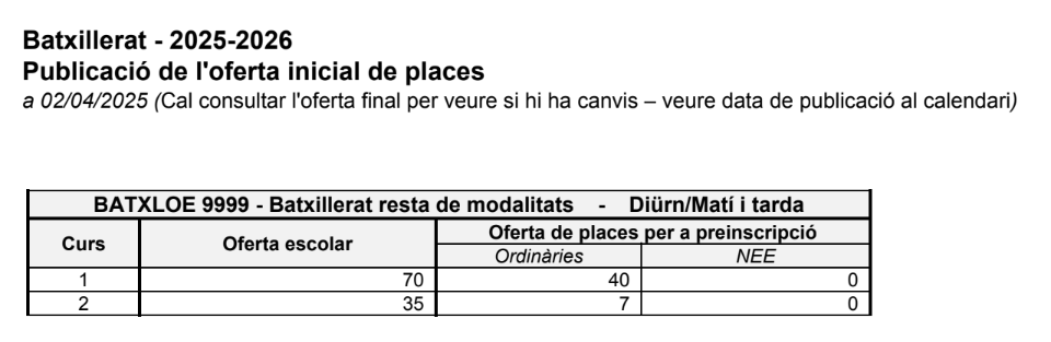 #preinscripcióTarradell – Oferta de places per a estudis de BatxilleratPer admin / 3 d'abril de 2025 / General Notícies Batxillerat / Batxillerat Publicació de l’oferta inicial de places per als estudis de Batxillerat a l’INS Miquel Tarradell.