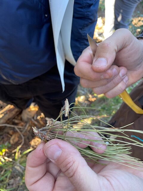 Amb els alumnes del cicle de grau superior de Gestió Forestal i del Medi Natural hem vist i interpretat la tallada sanitària d’emergència que s’ha hagut de fer recentment en el barranc dels Torners per a minimitzar l’atac del barrinador del pi Tomicus destruens. El Salvador Nogués, tècnic del Paratge Natural d’Interès Nacional de Poblet, ens ha mostrat també, una zona amb treballs forestals per a la prevenció d’incendis i un projecte futur de consolidació d’espais oberts i realització de conques esponja.