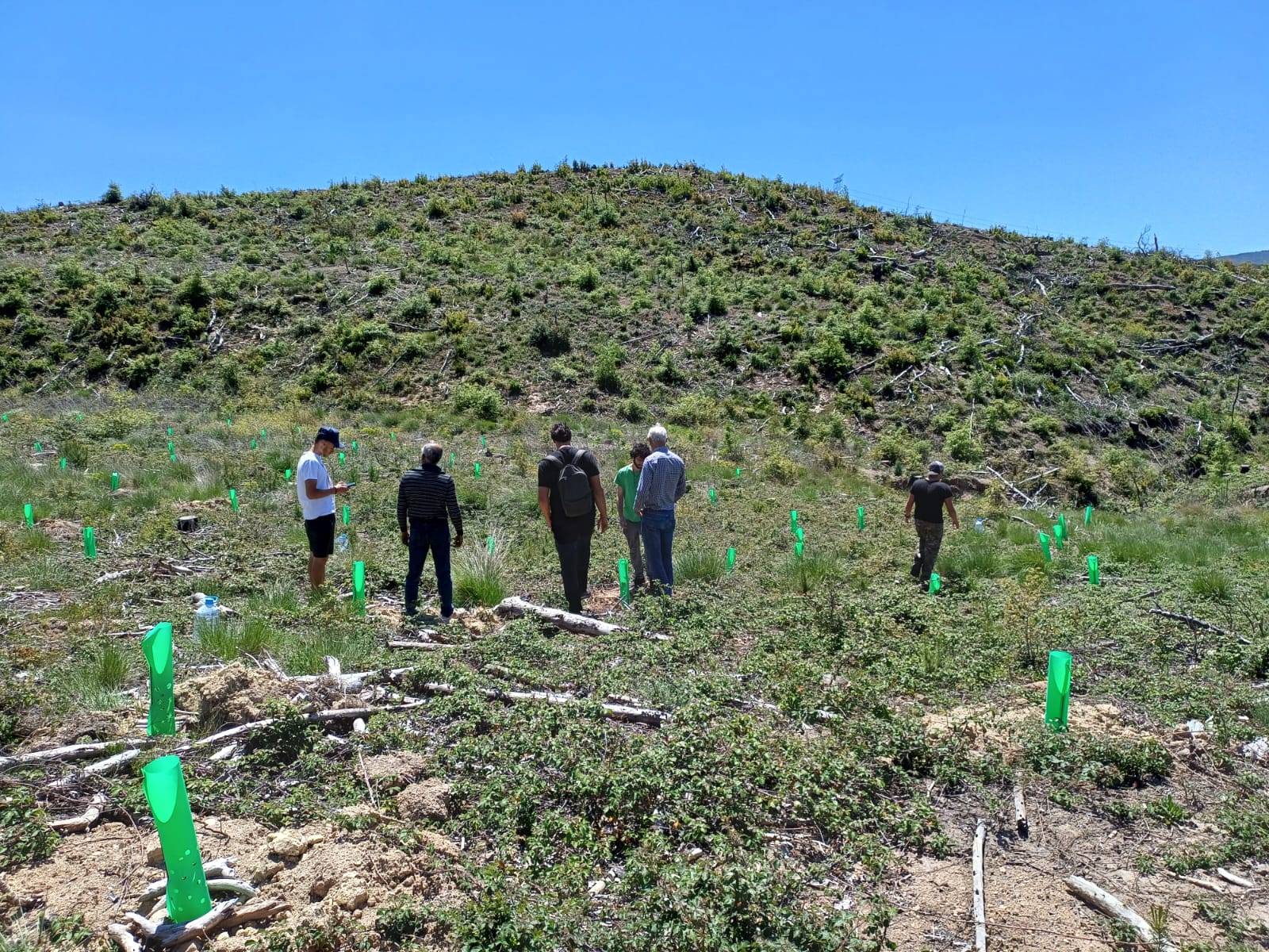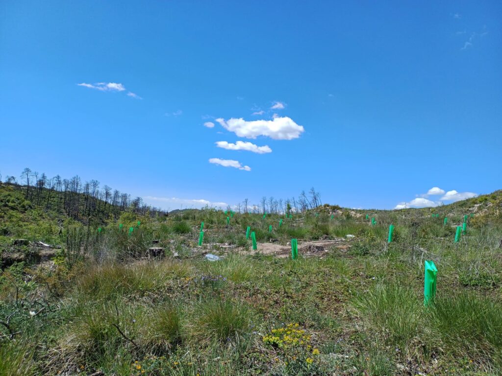 Detall de la repoblació (amb tubs protectors) i els arbres cremats al fons