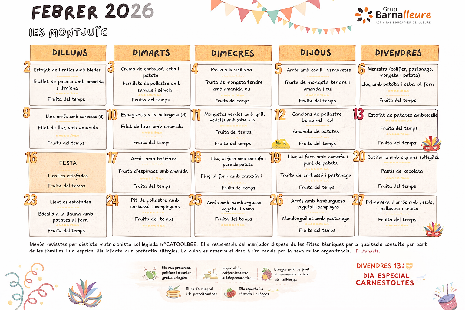 04/02/26Aquí podeu trobar el menú del menjador d’aquest mes. També trobareu l’enllaç a altres menús segons toleràncies.