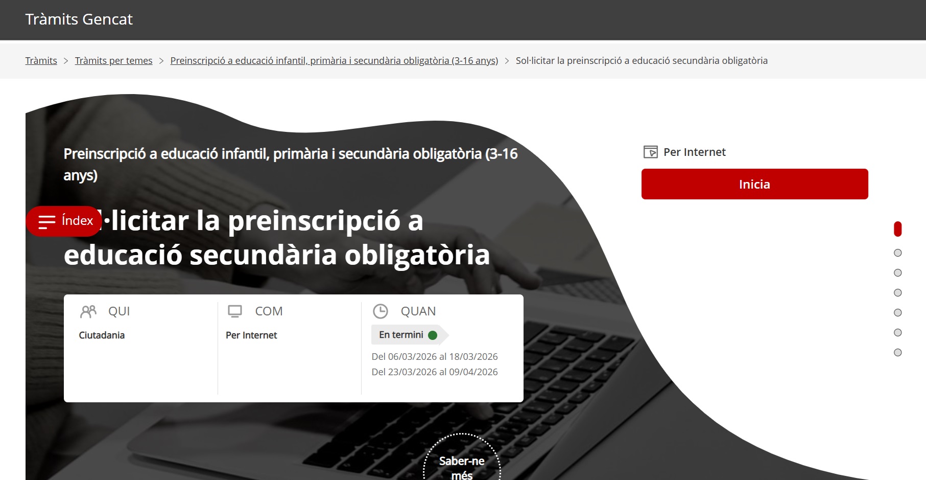 La sol·licitud de preinscripció d’educació secundària obligatòria, s’ha de presentar del 6 al 18 de març de 2026 i cal adjuntar-hi la documentació d’identificació o de criteris que correspongui. La documentació que no s’hagi pogut adjuntar durant el període de presentació de sol·licituds, es pot afegir fins al 19 de març de 2026. Si no s’ha pogut […]
