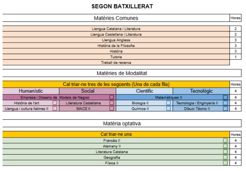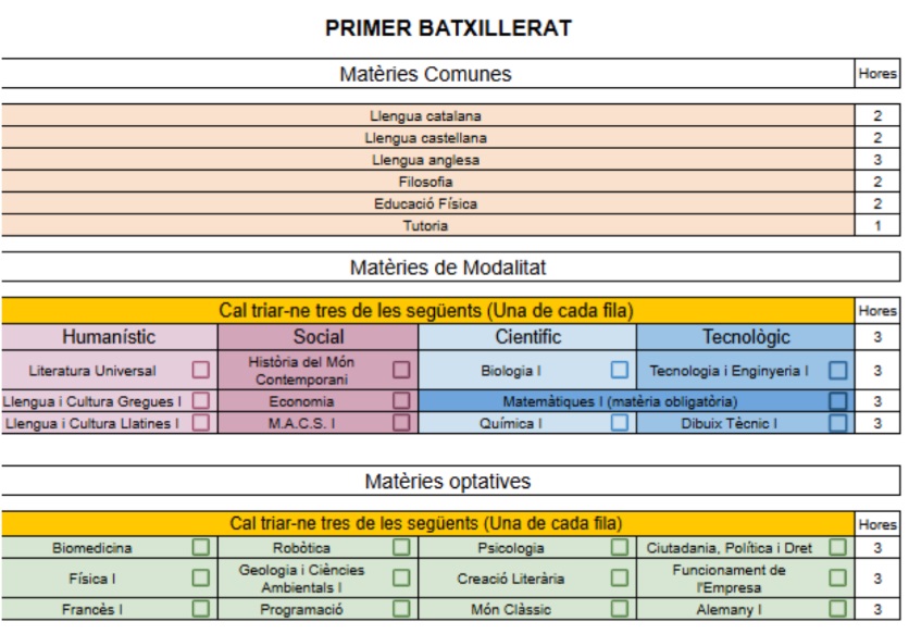 Cada curs de Batxillerat comprèn: