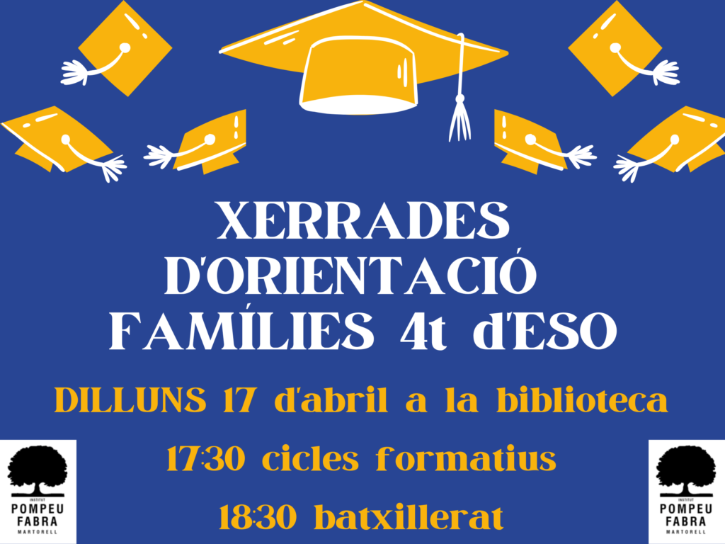 Convoquem a les famílies de 4t d’ESO a una xerrada d’orientació, tant per cicles formatius com per batxillerat. Us hi esperem!