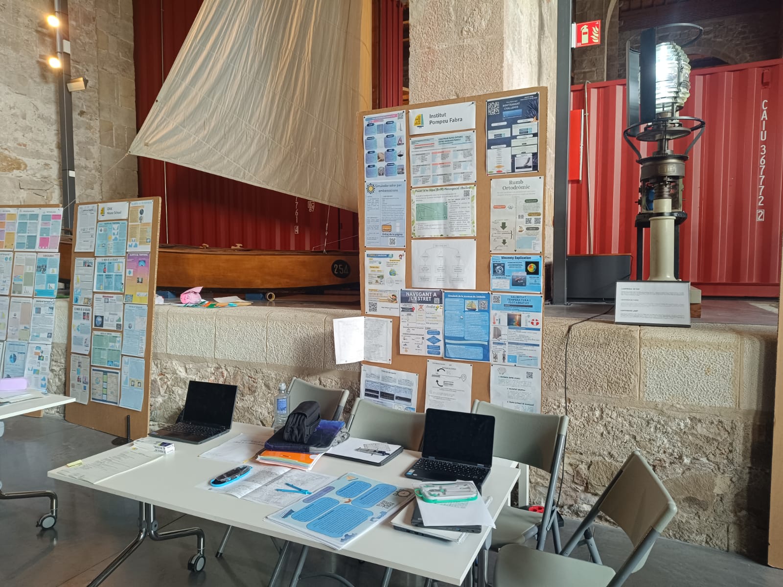 Ubicats a la zona del “Village”, l’espai destinat a la mostra d’estands dels centres, el nostre grup ha explicat diferents formes d’analitzar la nàutica, establint una comparativa entre mètodes tradicionals i tecnològics. Els alumnes han demostrat com treballar sobre una carta en paper utilitzant estris de dibuix nàutics i compàs, i ho han contrastat amb l’ús d’eines pròpies desenvolupades amb llenguatge JavaScript. Aquesta activitat ha servit per posar en valor tant els coneixements de navegació clàssica com les competències digitals adquirides a l’aula.