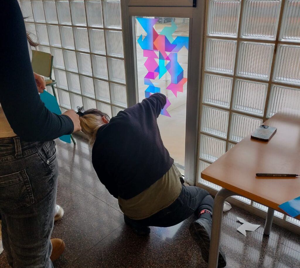 Després de donar-nos a conèixer la seva trajectòria del grafiti passant per la instal·lació fins a arribar als murals de gran format i fent una explicació de com la seva obra ha evolucionat des de l’organisme i la gestualitat fins a l’abstracció geomètrica. Hem gaudit d’una intervenció amb vinils de color en les vidrieres de l’artístic.