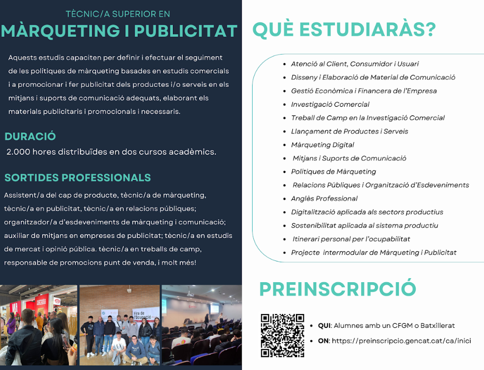 El Cicle Formatiu de Grau Superior de Màrqueting i Publicitat proporciona el títol de Tècnic Superior en Màrqueting i Publicitat. Aquests estudis capaciten per definir i efectuar el seguiment de les polítiques de màrqueting basades en estudis comercials i a promocionar i fer publicitat dels productes i/o serveis en els mitjans i suports de comunicació adequats, elaborant els materials publicitaris i promocionals i necessaris. La durada és de 2.000 hores (1.485 en un centre educatiu i 515 en un centre de treball) distribuïdes en dos cursos acadèmics si no es fa la modalitat dual.