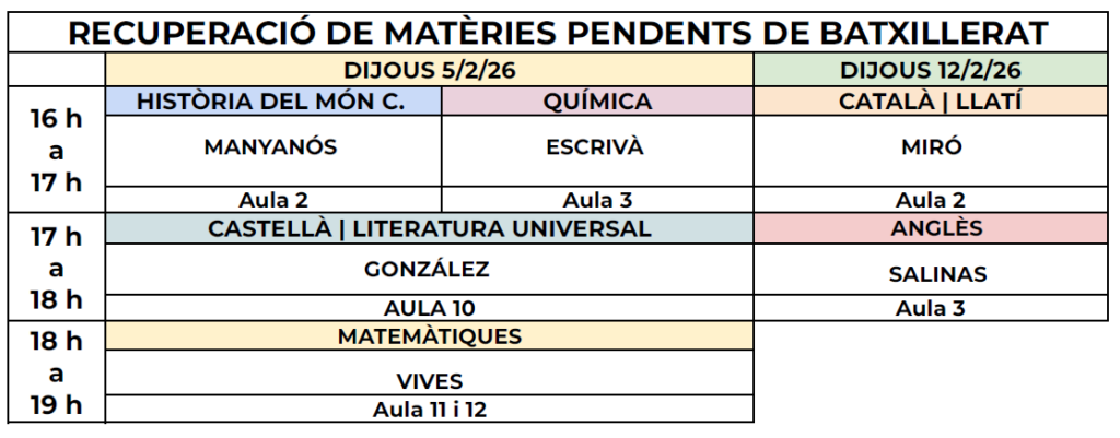 Calendari de proves de matèries pendents de BAT – febrer del 2026