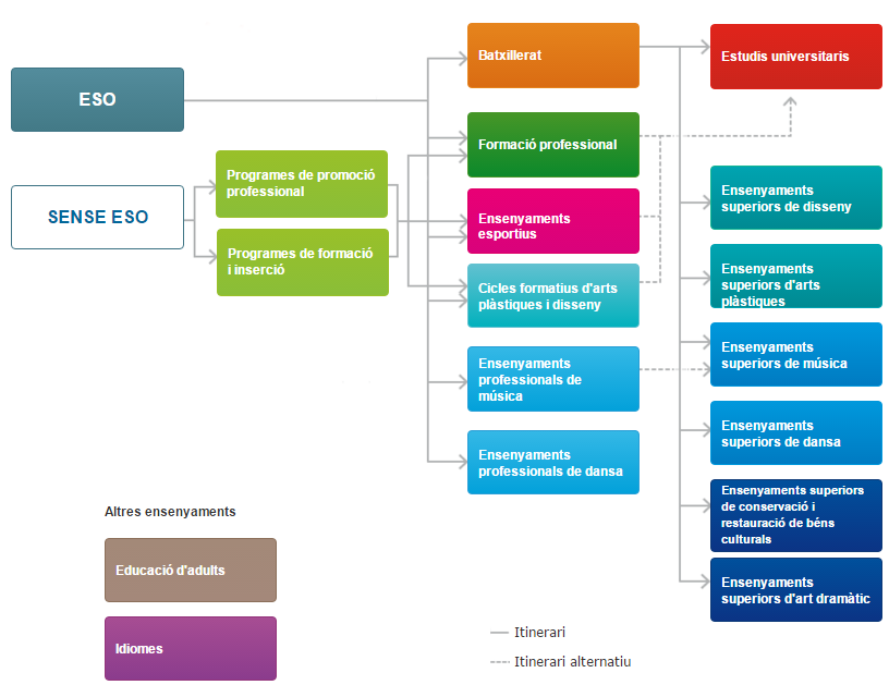 Clicant en el següent enllaç, podràs navegar pel mapa interactiu del Sistema Educatiu de Catalunya i consultar la possibilitat de cursar diferents ensenyaments per arribar a aconseguir els teus objectius professionals. En els diferents apartats hi trobaràs tota la informació que necessitis per construir el teu itinerari formatiu.