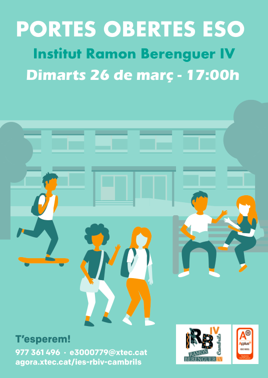 El passat dimarts 26 de març, l’INS Ramon Berenguer IV va dur a terme la Jornada de Portes Obertes ESO amb una gran assistència de famílies. Es va realitzar una reunió informativa, en què els membres de l’equip directiu i la resta de l’equip docent, exposaren el projecte educatiu del centre, basat en tres grans objectius: èxit acadèmic, cohesió social i ciutadania global. Mentrestant, els més petits van gaudir de tot un seguit de tallers pedagògics de matemàtiques, ciències experimentals i tecnologia. Un cop finalitzada la reunió, es va procedir a recórrer les instal·lacions del centre, amb l’acompanyament del professorat.