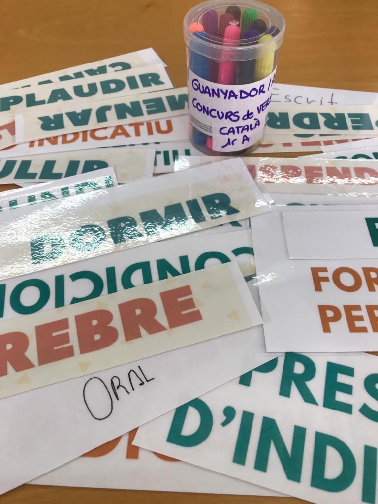 L’alumnat de primer d’ESO ha realitzat un concurs de verbs per repassar per l’examen. La dinàmica ha sigut en format concurs. Per equips han hagut d’anar sumant punts per poder arribar a la semifinal. Cada company ha triat el verb i el temps verbal dels seus contrincants. Aquest, per poder aconseguir el punt, l’havia de conjugar correctament. Hi ha hagut molts finalistes i el primer premi ha estat molt disputat.