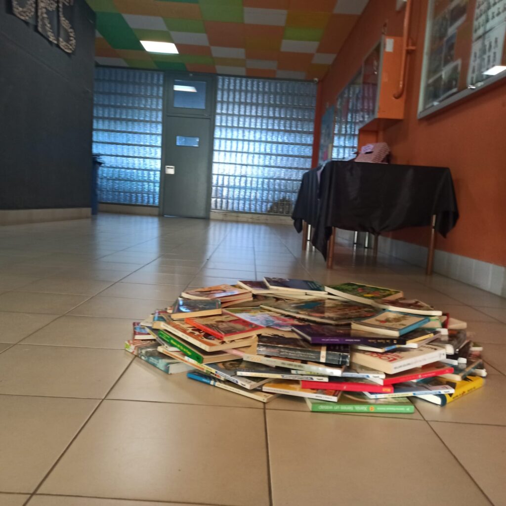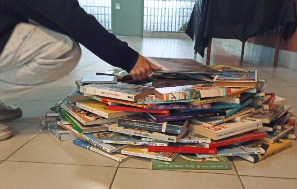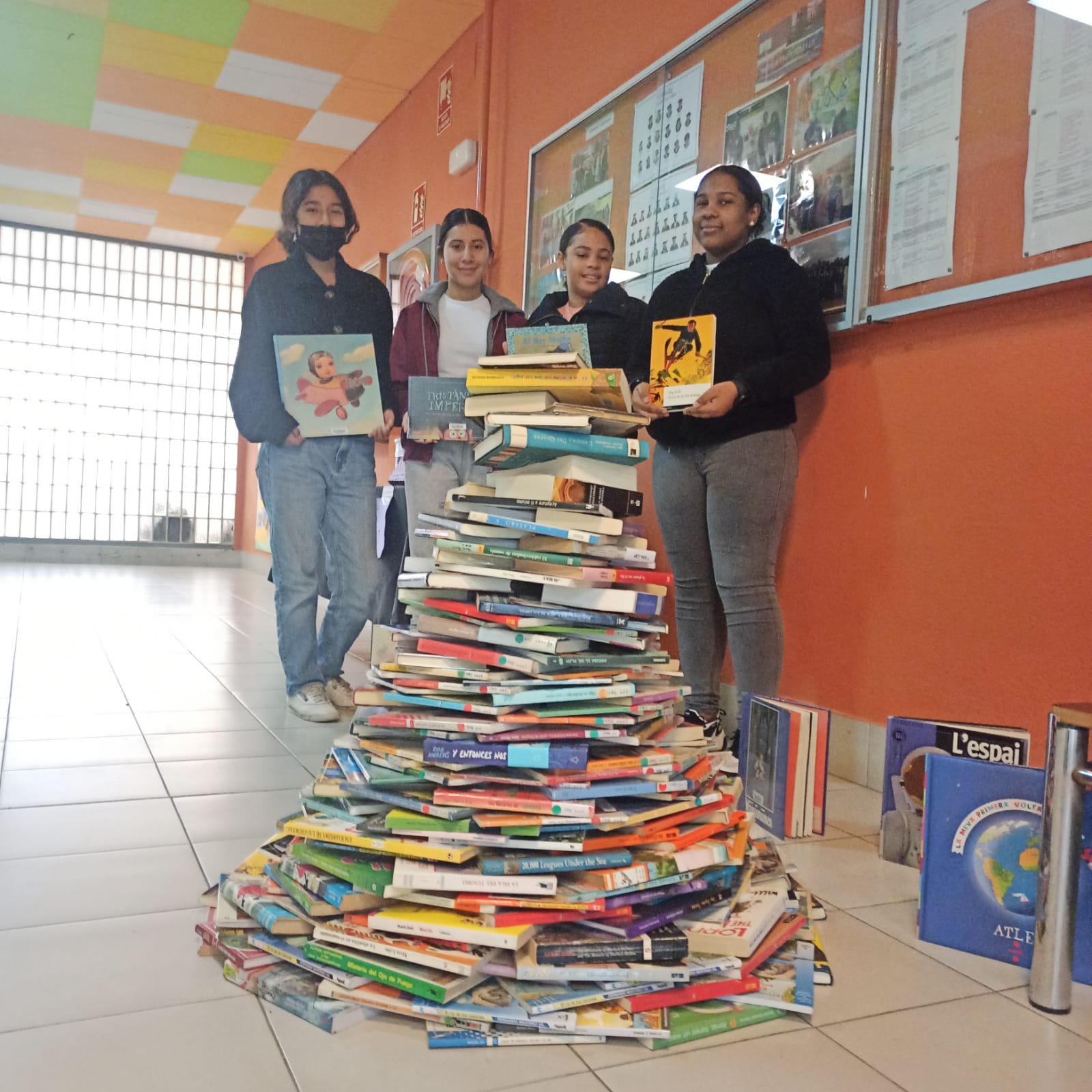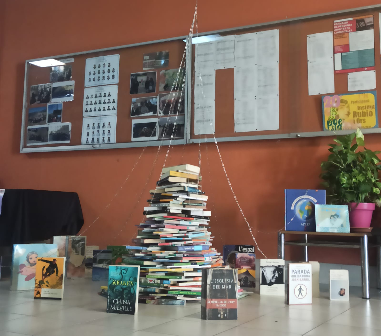 El tronc de l’arbre s’uneix a les branques en una piràmide de llibres, portats per alumnat, professorat o donats.