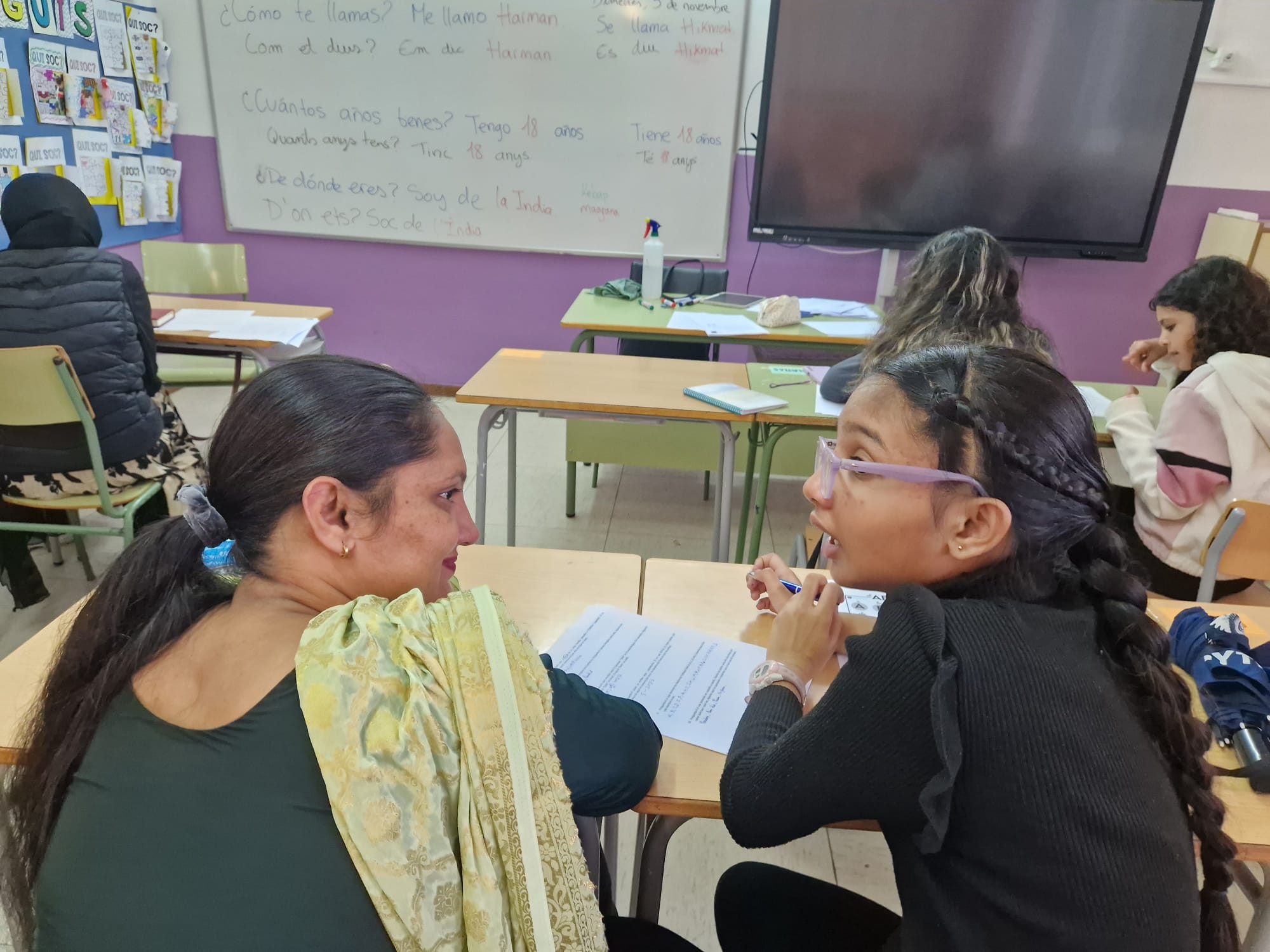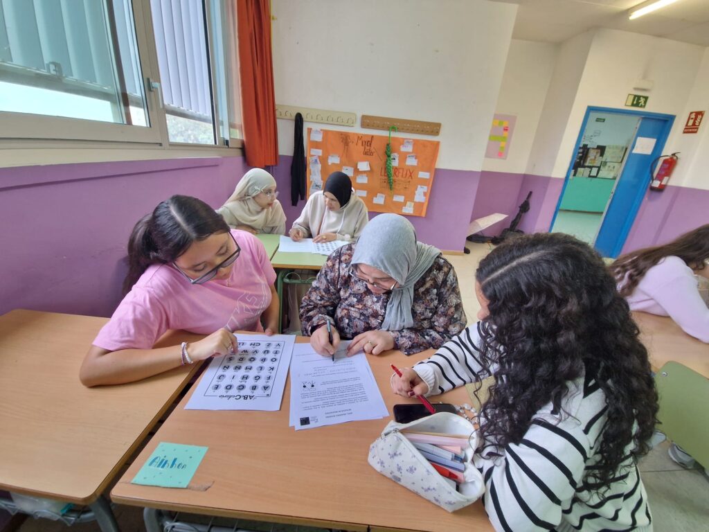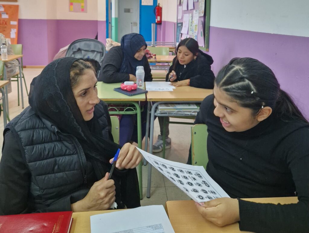 Les mares i familiars participants aprenen català i castellà amb el suport de l’equip voluntari d’alumnes que les ajuda.