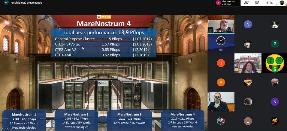 Les sessions telemàtiques han estat dirigides per l’Oriol Riu (MareNostrum Visitors Manager), qui ens ha explicat de primera mà la tecnologia de l’actual supercomputador MareNostrum4 i la prevista pel MareNostrum5 (actualització al 2021).