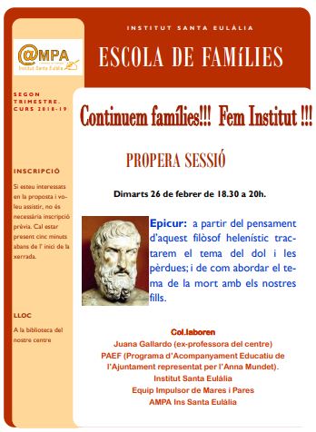 El dimarts 26 de febrer es va celebrar una nova sessió de l’Escola de Famílies; aquest cop es va aprofitar la figura del filòsof grec Epicur per parlar dels diferents tipus de pèrdues i de les fases del dol. Va ser una sessió molt emotiva.