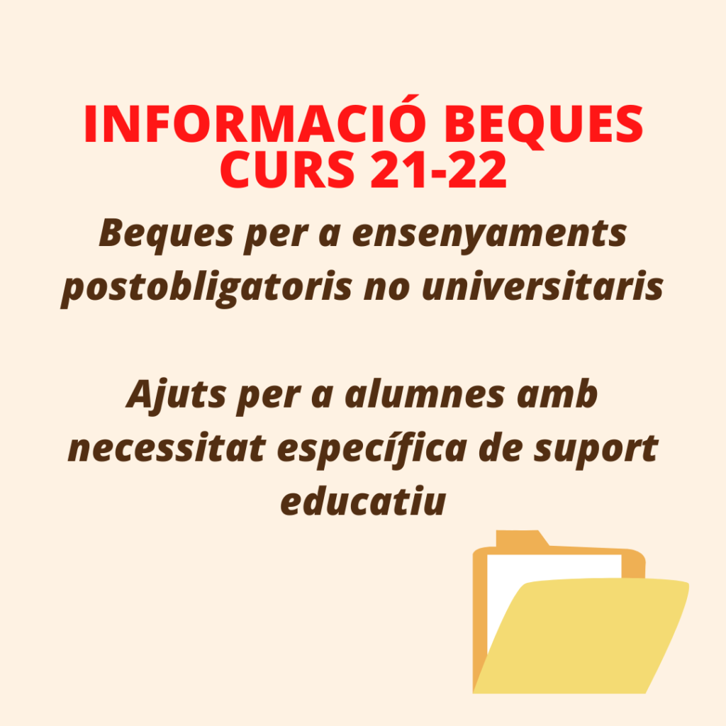 A continuació trobareu la informació oficial referida a les beques que podeu demanar al Departament d’Educació de la Generalitat de Catalunya: BEQUES PER A ENSENYAMENTS POSTOBLIGATORIS NO UNIVERSITARIS del 3/08 al 30 de setembre de 2021 AJUTS PER A ALUMNES AMB NECESSITATS ESPECÍFIQUES DE SUPORT EDUCATIU el 3/08 al 30 de setembre de 2021