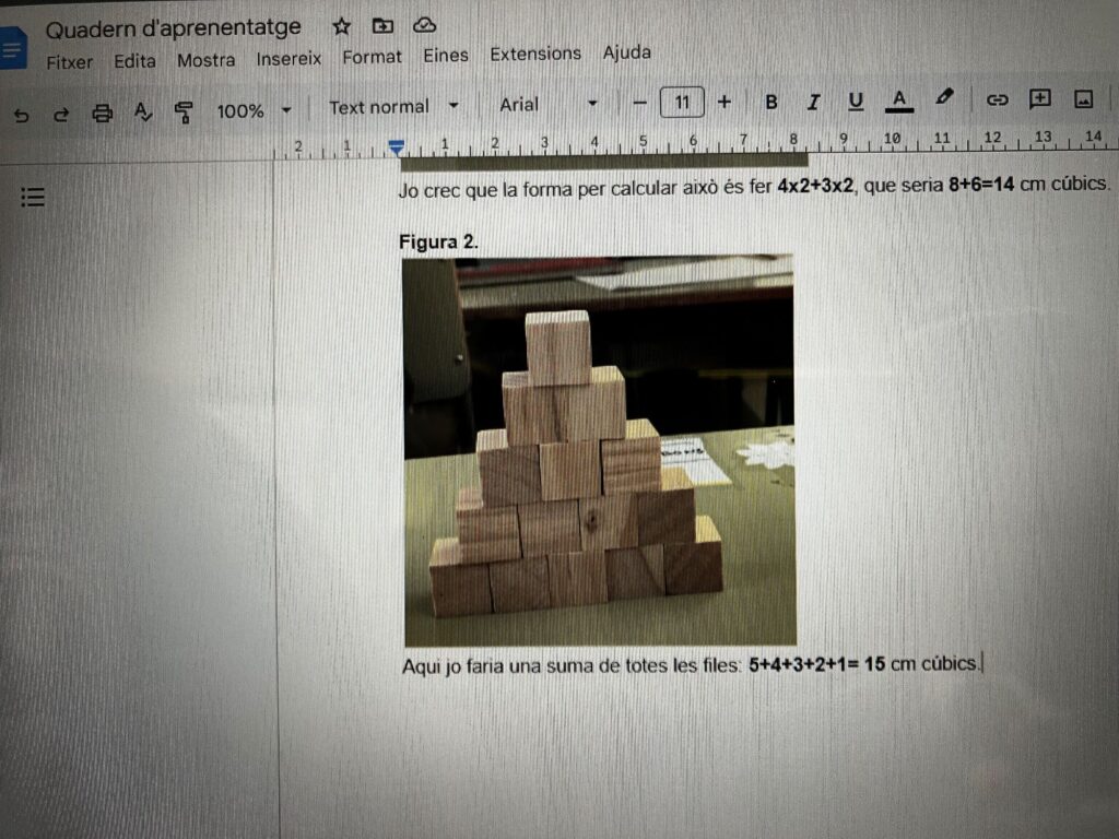 Finalment, tots els alumnes han hagut d’incorporar imatges de les figures generades, conjuntament amb les seves reflexions, acompanyades del procediment proposat per al càlcul del volum amb operacions matemàtiques. D’aquesta manera, hem aconseguit que l’alumnat fes una connexió important: entendre que calcular el volum d’una figura de tres dimensions no és res més que efectuar un recompte de cubs d’acord amb un patró cúbic prèviament definit.