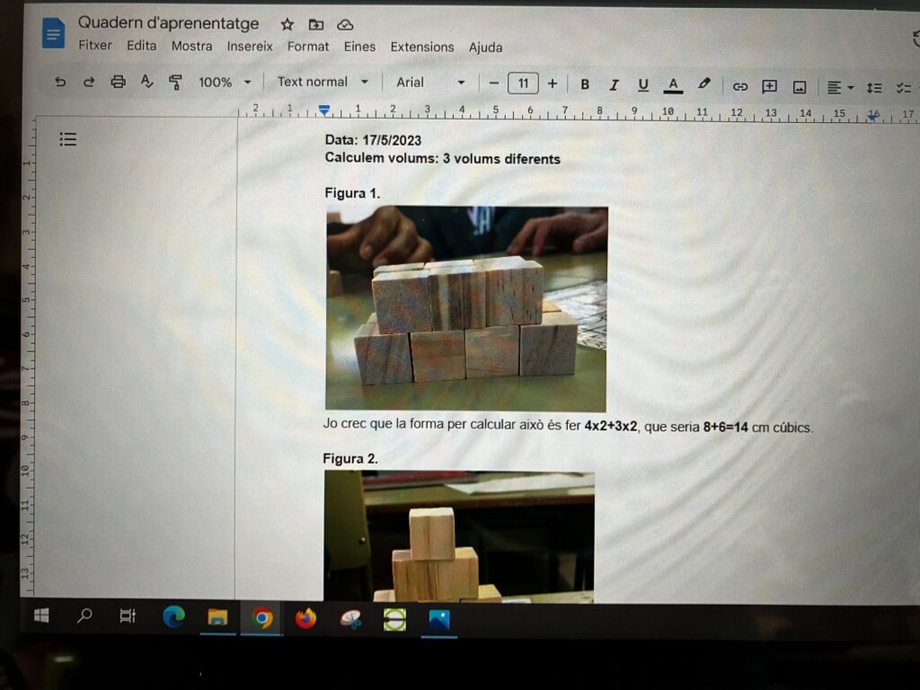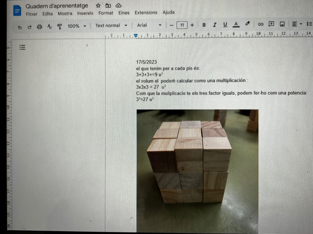 Finalment, tots els alumnes han hagut d’incorporar imatges de les figures generades, conjuntament amb les seves reflexions, acompanyades del procediment proposat per al càlcul del volum amb operacions matemàtiques. D’aquesta manera, hem aconseguit que l’alumnat fes una connexió important: entendre que calcular el volum d’una figura de tres dimensions no és res més que efectuar un recompte de cubs d’acord amb un patró cúbic prèviament definit.