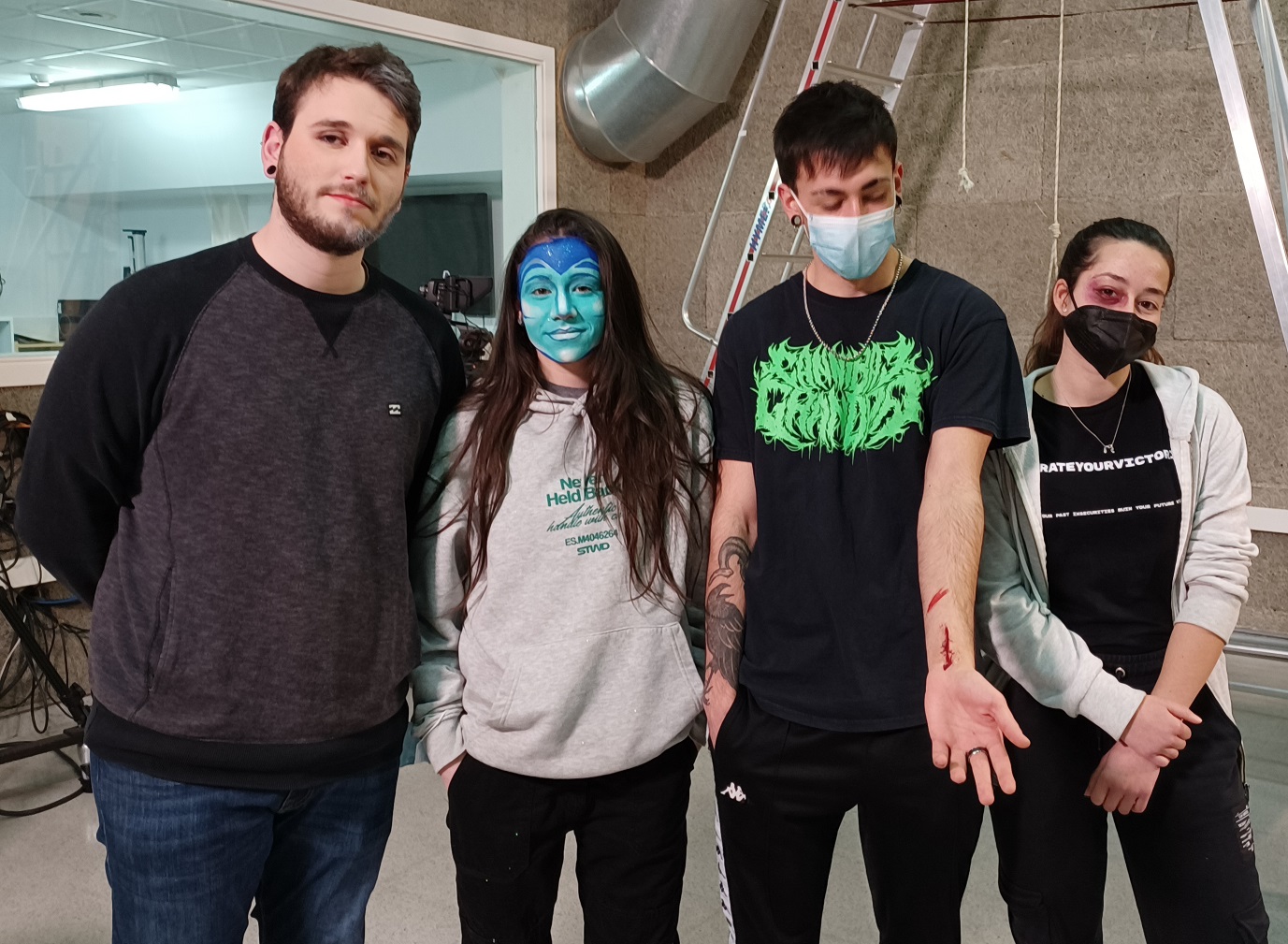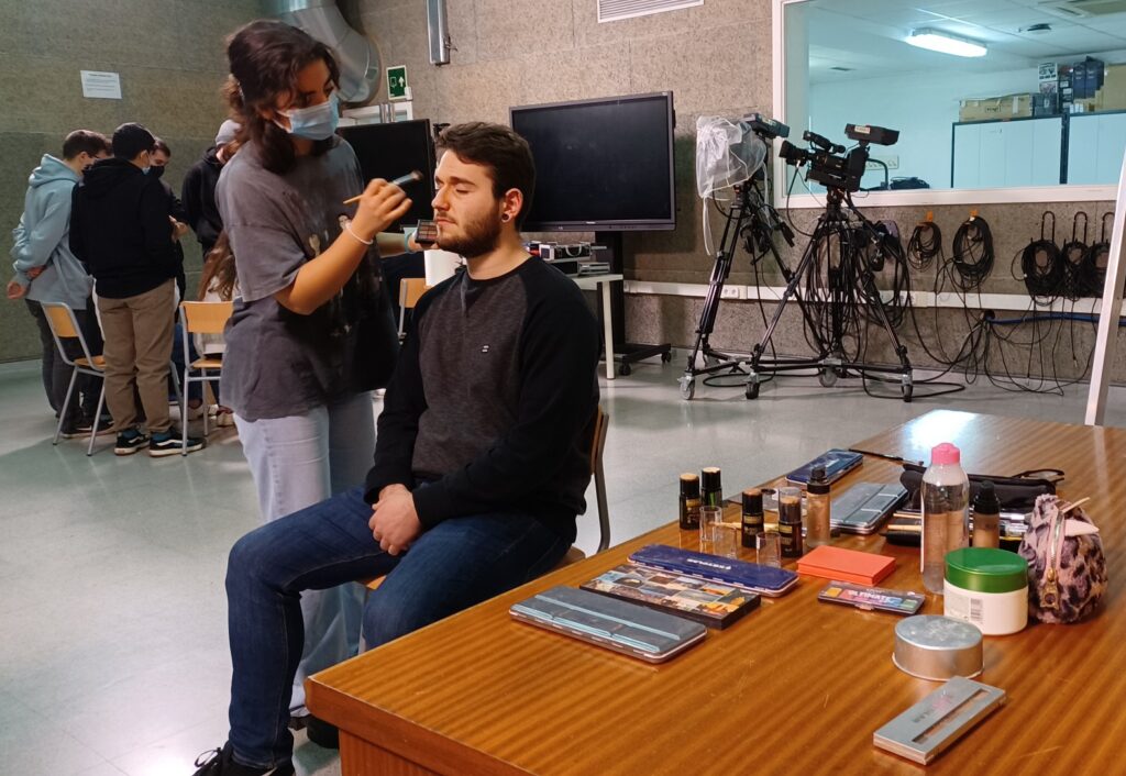 L’alumnat del CFGS Realització de Projectes d’audiovisuals i espectacles ha après de forma lúdica i didàctica les diferències entre el maquillatge escènic i l’audiovisual, els materials que s’utilitzen i quins són els procediments habituals en un rodatge o espectacle. Després, els i les maquilladores han realitzat una demostració pràctica amb voluntaris/es d’entre els estudiants d’Imatge i so, que s’ho han passat molt bé veient els resultats als seus rostres i cossos.