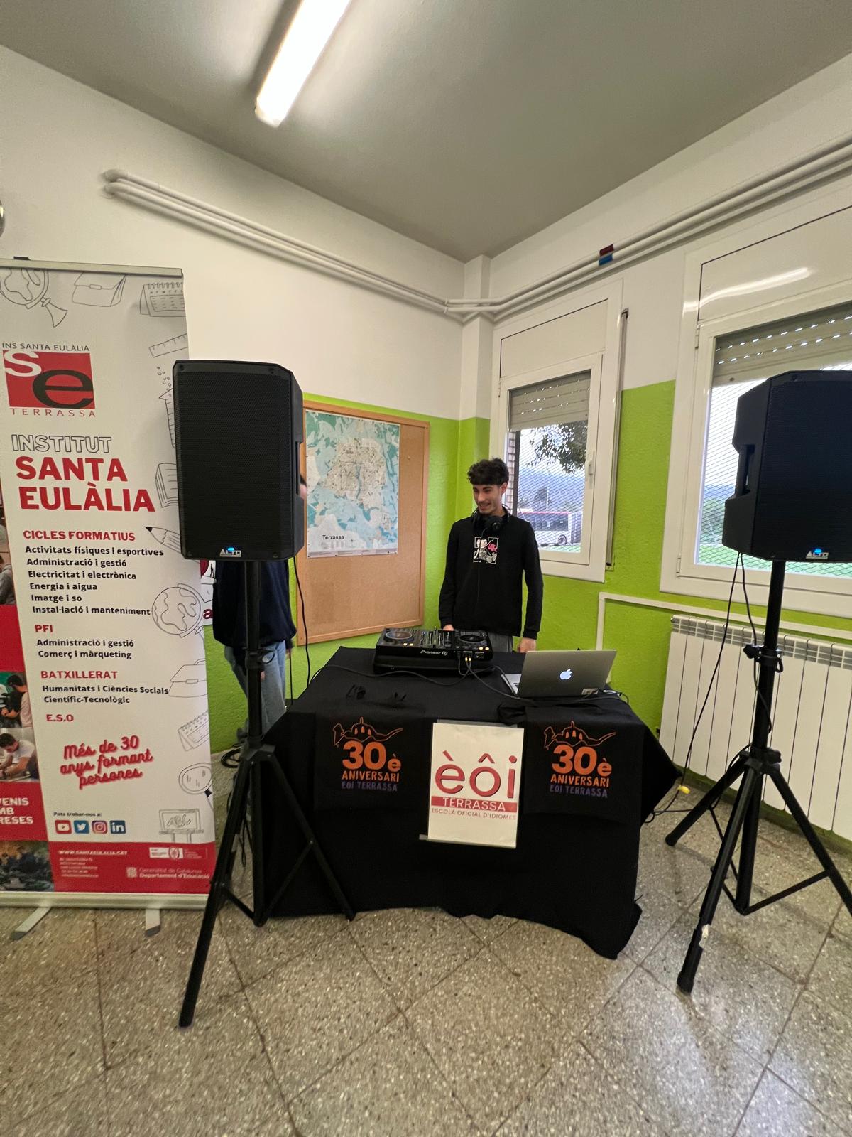scola oficial d’idiomes de Terrassa celebra el seu 30è aniversari amb una sèrie d’activitats i festivitats. El nostre institut col·labora amb la realització d’una sèrie de sessions per amenitzar aquestes celebracions, amb un conveni de col·laboració emmarcat en el programa InnovaFP. Alumnat del CFGM Videodisjòquei i so s’ha desplaçat fins a la seva seu per muntar els seus dj sets i punxar els millors temes que han fet ballar a professorat i alumnat de l’EOI.