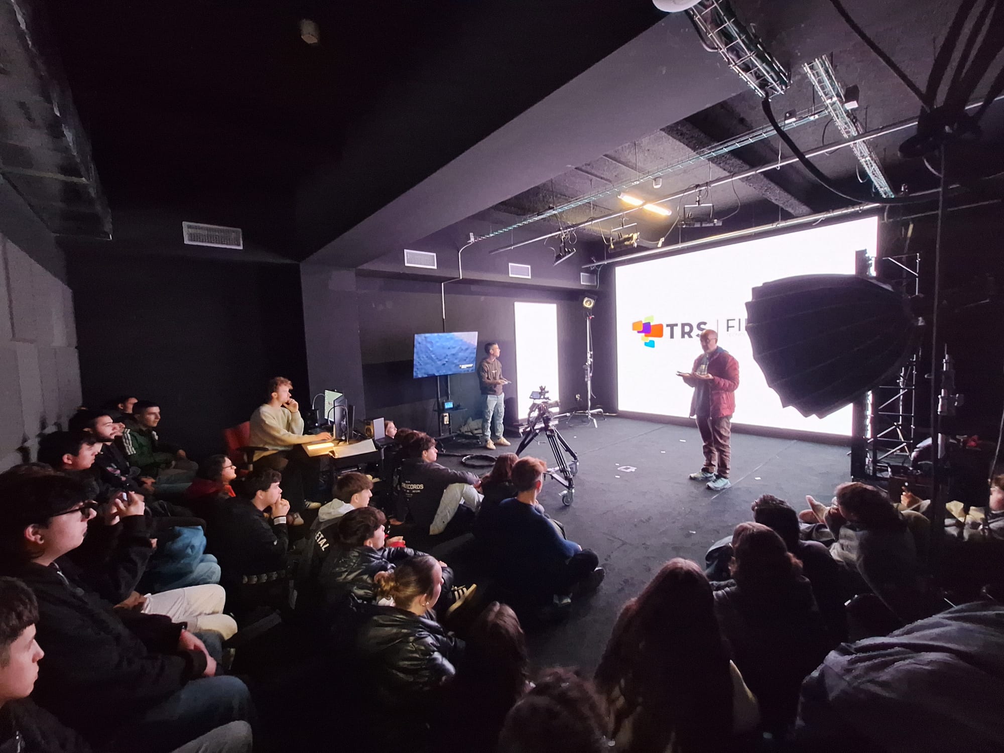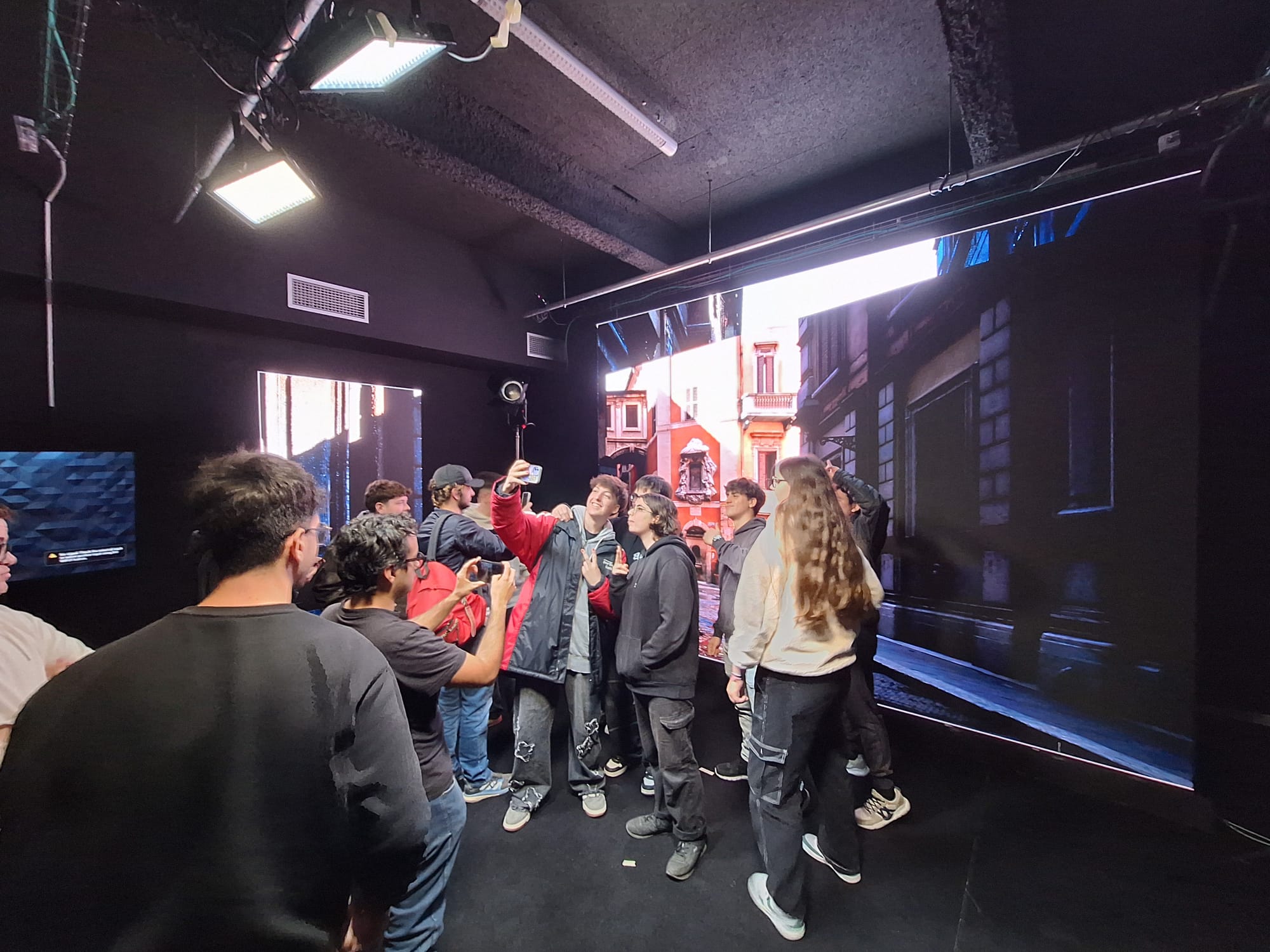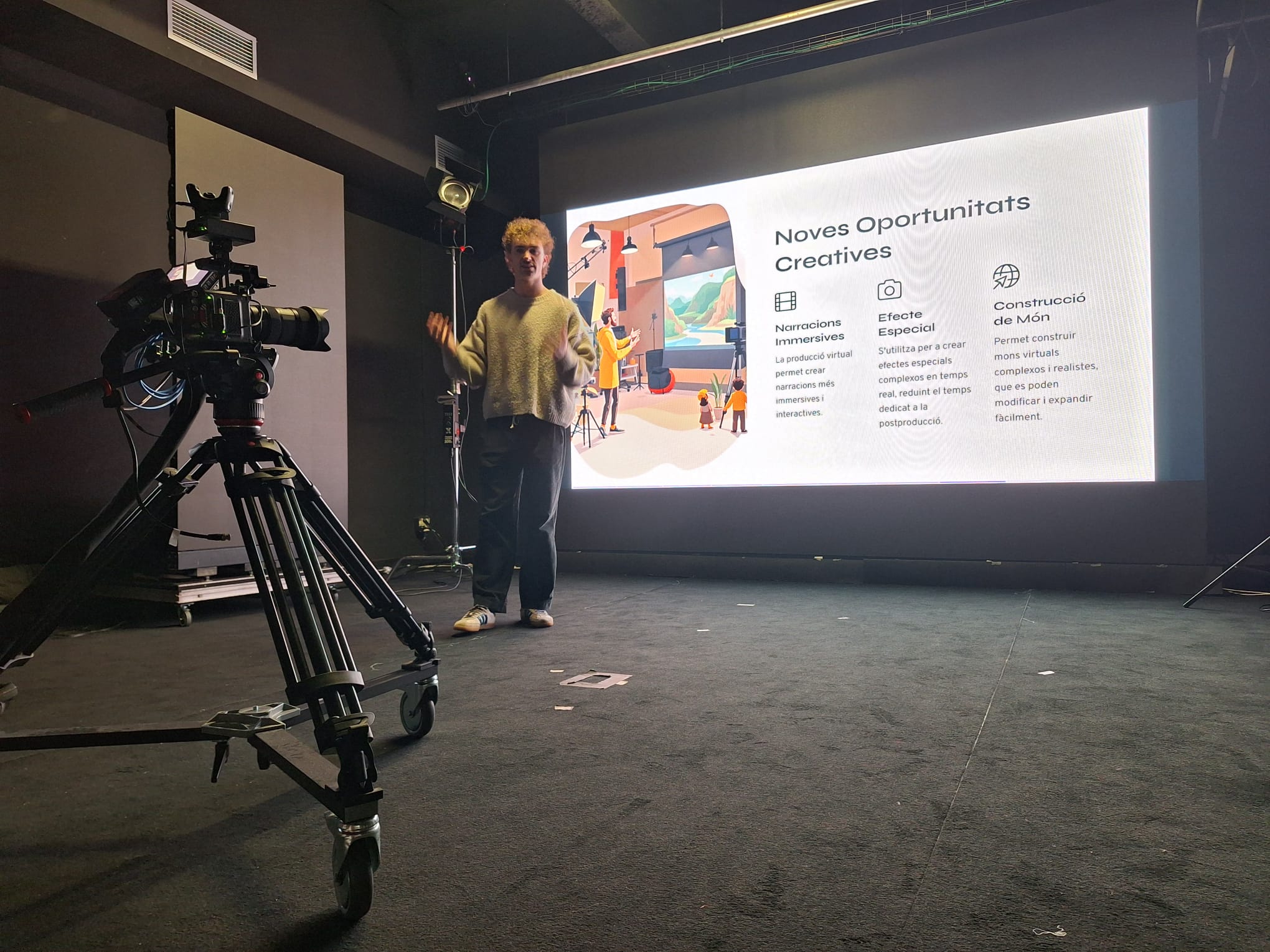 El grup del CFGM Videodisjòquei i so ha pogut visitar el parc Audiovisual de Catalunya i el Terrassa Film Lab, situat a l’antic Hospital del Tòrax. Aquest espai altament tecnològic es una instal·lació totalment equipada per realitzar producció virtual, una innovació audiovisual que últimament estem veient aplicada en grans produccions cinematogràfiques com “The Mandalorian”. La virtual production consisteix en la substitució d’escenografies i fons per imatges virtuals projectades en pantalles LED de grans dimensions.