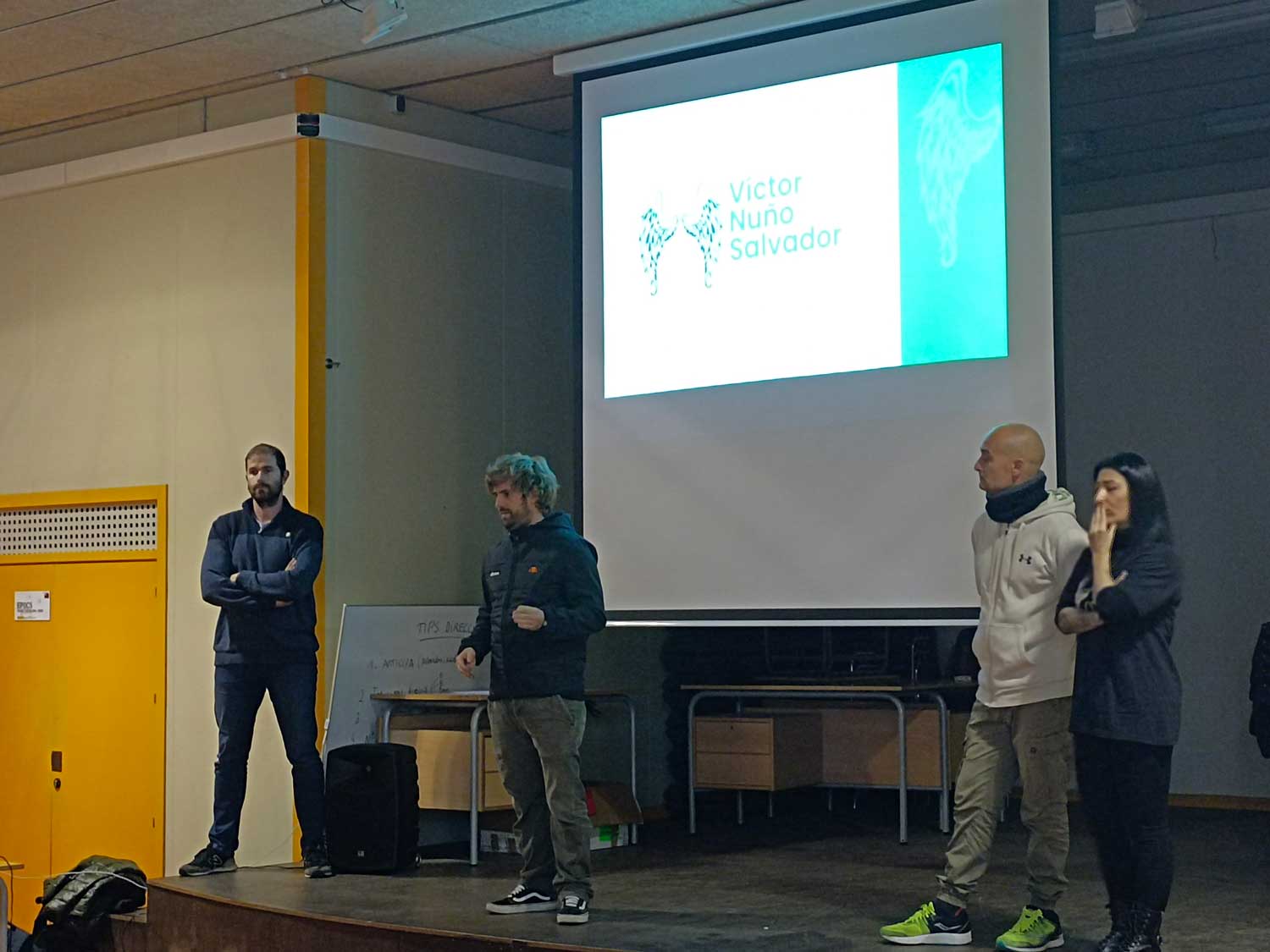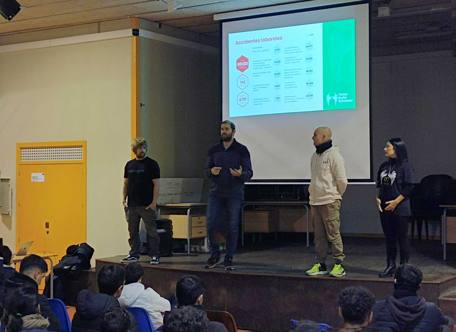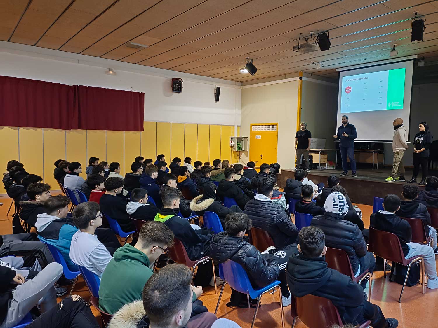 Ahir es va fer un acte de PRL (prevenció de riscos laborals) al gimnàs del centre amb alguns grups d’alumnes. Han vingut a fer una xerrada Lluís Vicent ( cap – formador i bomber d’empresa ), Emili Roure (formador i bomber oficial ) Iván ( va patir accidentat laboral ) i Noelia (mare de Víctor Nuño, que va morir per accident laboral en 2020). Pertanyen a l’Associació Víctor Nuño, que lluita per aconseguir més seguretat a la feina per a tots els treballadors.