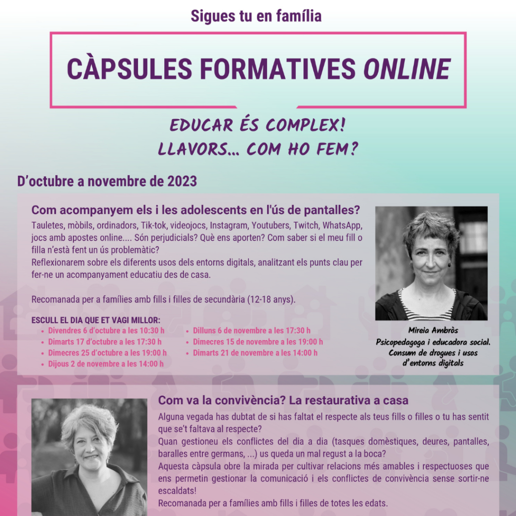 Des del «Sigues tu» posem a disposició de les famílies fills i filles de 12 a 18 anys dues càpsules formatives online. Aquestes sessions es duran a terme a través de la plataforma Zoom. Càpsules formatives online Formacions de dues hores de durada de la mà de professionals que donaran recursos i eines per acompanyar les famílies en temes relacionats