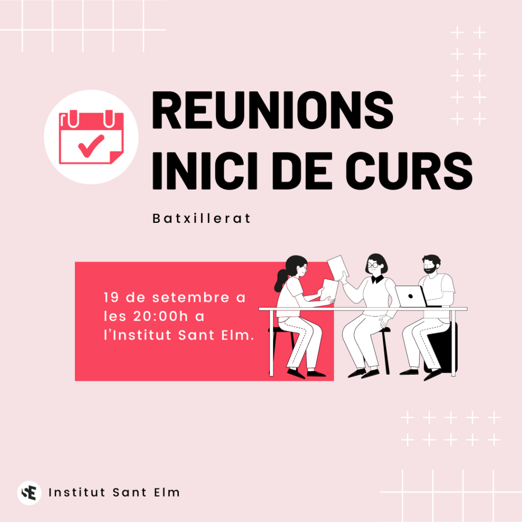 El proper dimarts, 19 de setembre, a les 20:00h es faran les reunions de famílies dels alumnes de 1r i 2n de Batxillerat. Cada tutor/a ja s’haurà posat en contacte amb les famílies per tal d’informar sobre aquesta reunió.