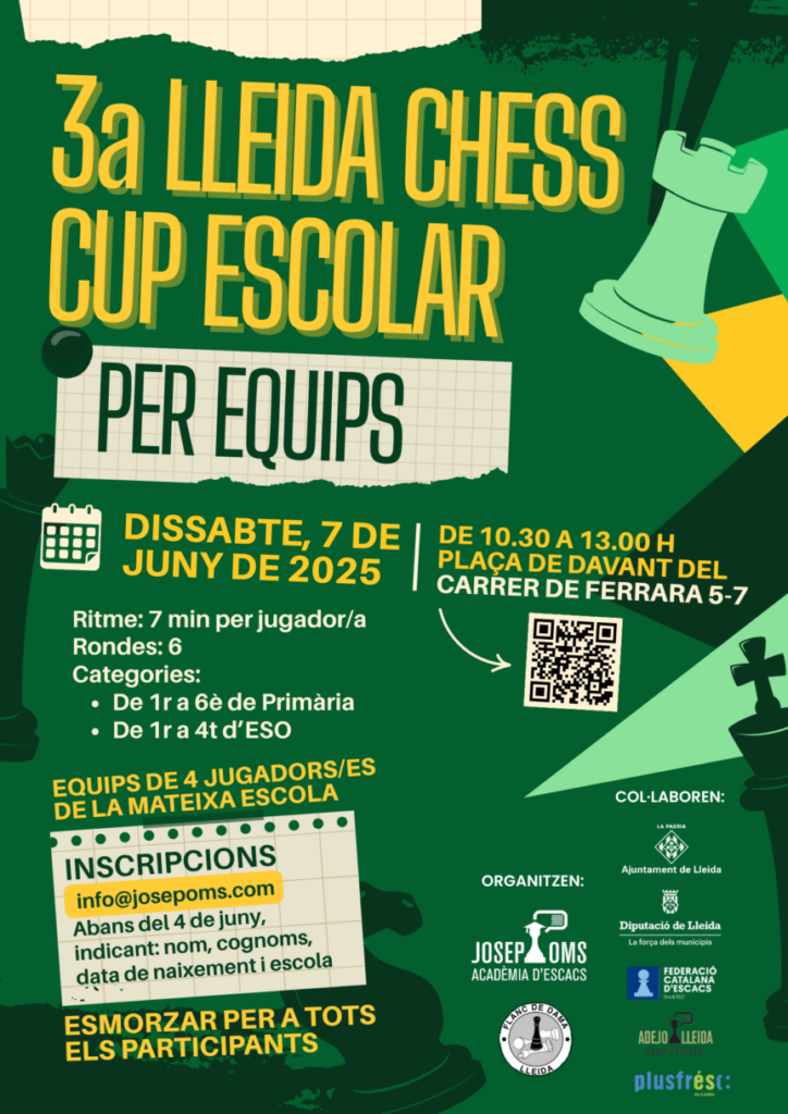 Aquest dissabte 7 de juny hem tornat a participar en la Lleida Chess Cup Escolar, organitzada per l’Acadèmia d’Escacs Josep Oms. Havíem de tenir un equip de quatre jugadors/es, a pesar de tenir-ne cinc d’inscrits, ens han faltat dos jugadors per a fer equip, i el cert és que els dissabtes… ens continuen guanyant la partida. Tanmateix, ens han deixat participar, i hem gaudit una vegada més dels escacs, emperò, en jugar contra equips complets ja teníem 2 derrotes, tal i com glossa el reglament, per tant, no podíem aspirar a grans coses. Ha estat una experiència formidable una vegada més. El nostre equip ha estat format per Deniss Illa i Vlad Tribu en la categoria d’instituts i s’ha classificat en tercera posició amb els següents resultats: