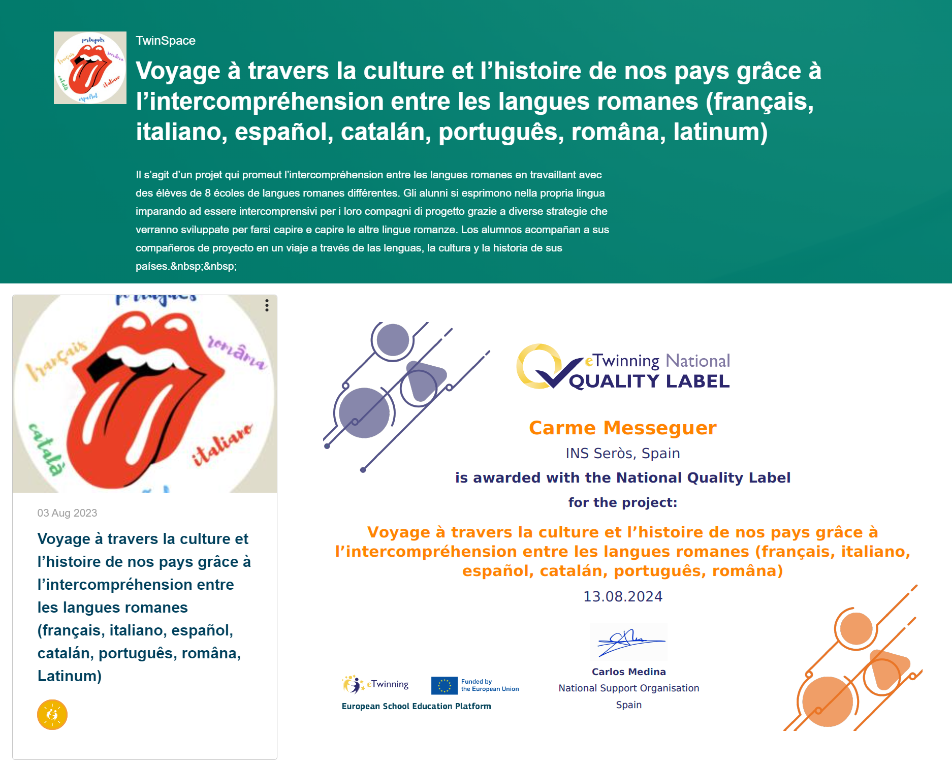 L’Agència nacional espanyola ha concedit un “segell de qualitat nacional” al projecte eTwinning sobre “Intercomprensió entre llengües romàniques”, desenvolupat el curs passat per les professores Carme Gairí i Carme Messeguer amb els seus alumnes de Traducción de textos de 1r de Batxillerat i de Llatí de 4t d’ESO en col·laboració amb altres instituts d’Europa (Portugal, França, Itàlia, Romania i Alemanya). L’obtenció d’aquest distintiu suposa un pas més en favor del reconeixement de la vocació europea de l’INS Seròs.