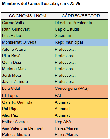 El consell escolar del centre és l’òrgan col·legiat de participació de la comunitat escolar en el govern del centre. En el consell escolar hi ha representats tots els col·lectius que intervenen en la comunitat educativa: director o directora, professorat, personal d’administració i serveis, famílies, alumnes i administració.