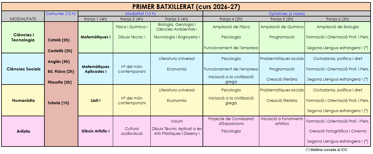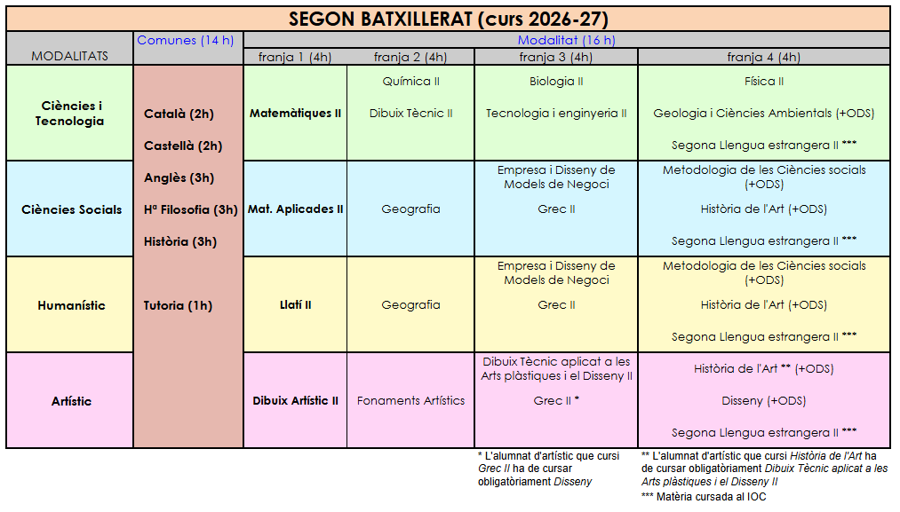 - BATXILLERAT: Etapa que té una durada de dos cursos acadèmics i que es cursa un cop s’ha completat l’ESO o un Cicle Formatiu de Grau Mig. Les modalitats que ofereix el centre són:
