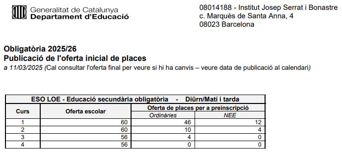 - També podeu consultar l’oferta de places per al curs 2025-26 al mapa escolar de Catalunya, indicant el codi del nostre centre: 08014188