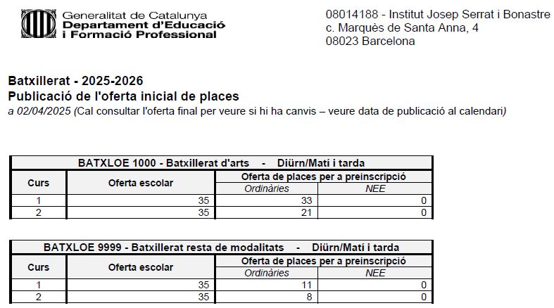 - Aquesta oferta no és definitiva i pot patir canvis en l’oferta final derivats de la demanda, de necessitats en l’escolarització o l’evolució de la matrícula continuada durant el curs actual.