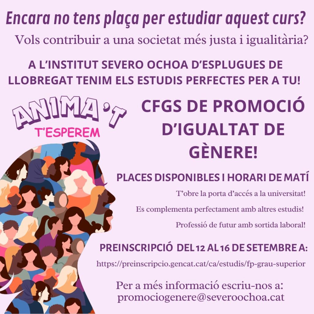 PLACES DISPONIBLES AL CICLE FORMATIU DE GRAU SUPERIOR DE PROMOCIÓ D’IGUALTAT DE GÈNERE Isa Burgos03/09/24 Places disponibles per al curs 24/25!