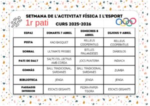 El passat 6 d’abril es va celebrar el dia Mundial de l’Activitat Física (DMAF) per promoure un estil de vida actiu i reduir el sedentarisme, seguint les recomanacions de lʼOMS. És per aquest motiu que, durant aquesta setmana, al centre durem a terme diferents activitats relacionades amb lʼactivitat física i la pràctica esportiva durant les hores del pati, i finalitzarem amb les activitats del divendres 10 dʼabril.