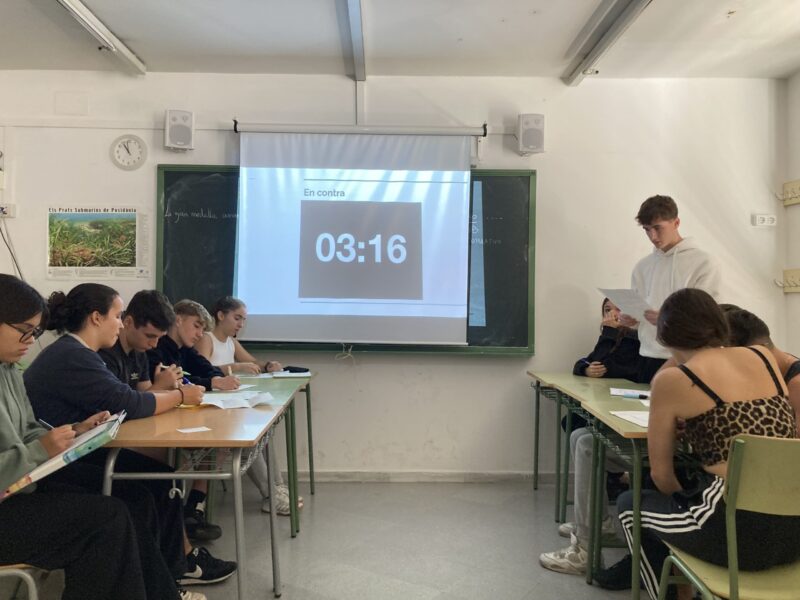 Els alumnes de l’assignatura Ciutadania, Política i Dret de primer de Batxillerat estan disputant una lliga de debat per equips les classes de divendres. El debat permet practicar la retòrica i l’argumentació i tractar de manera pràctica les problemàtiques que són els continguts clau d’aquesta matèria. La iniciativa ha estat tan ben rebuda pels alumnes que vam decidir optar per aconseguir una plaça en la “Lliga de debat de secundària i Batxillerat” de la Xarxa Vives i… Al febrer un equip format per 5 alumnes representarà a l’INS Vila de Gràcia a la Universitat Abat Oliba CEU buscant la seva classificació a la fase local. El tema del debat serà: Cal regular les xarxes socials per combatre la desinformació?