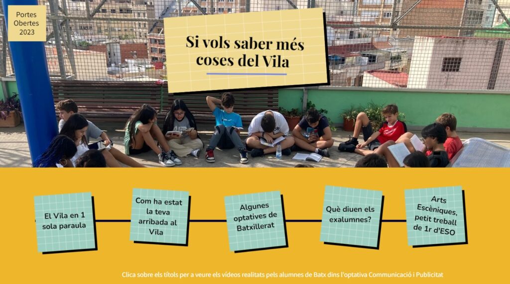 En aquesta presentació veuràs diferents vídeos que han realitzat els alumnes de 1r de Batxillerat dins l’optativa de “Comunicació i Publicitat” parlant de l’institut.